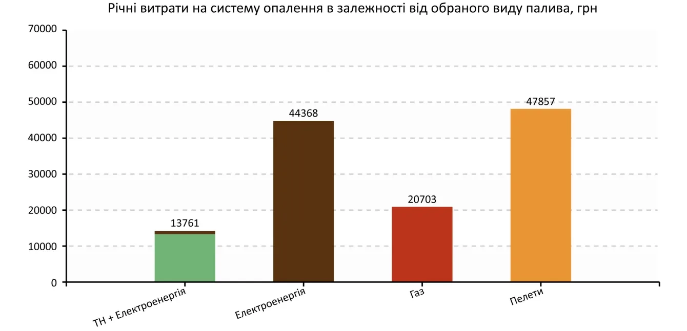 На малюнку показано орієнтовні експлуатаційні витрати на опалення будинку в м. Київ площею 150 м2 із середнім рівнем утеплення під час використання різного виду палива.